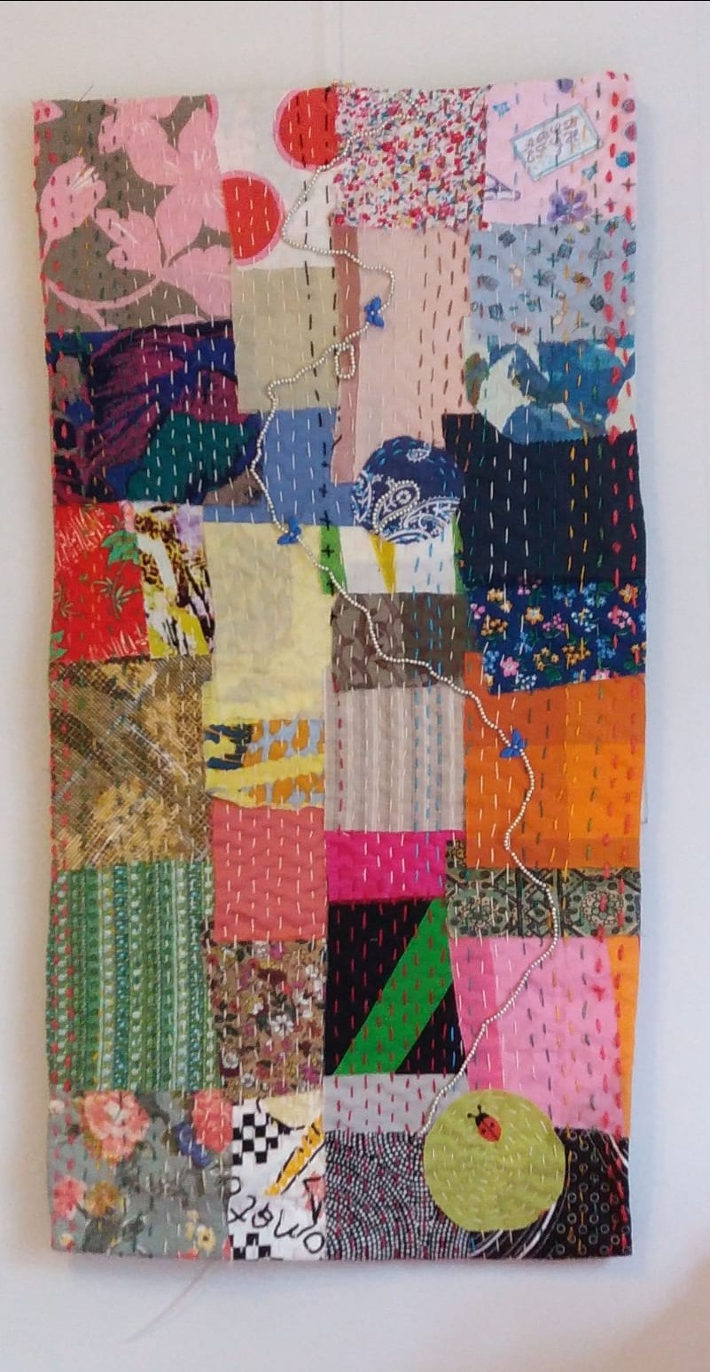 "Jokaisella teoksen tilkulla on merkitys elämäni polulla. Osasta olen tehnyt itselleni vaatteita, jonkun vaateen olen saanut, joistakin olen tehnyt tyttärilleni vaatteita, joitain tilkkuja olen saanut tärkeiltä henkilöiltä. Helmistä kirjomani ”polku” ovat vanhasta hameestani, jotka olen säästänyt tätä työtä varten. Perhoset polun varrella kuvastavat kolmea lastamme".