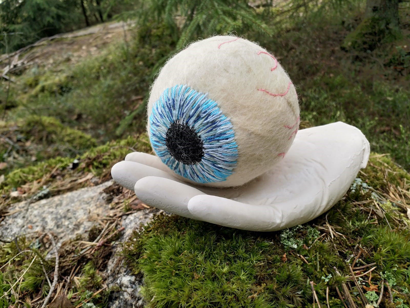 Teos koostuu kahdesta osasta: kipsisestä kädestä ja kirjonnalla koristellusta huovutetusta silmästä.