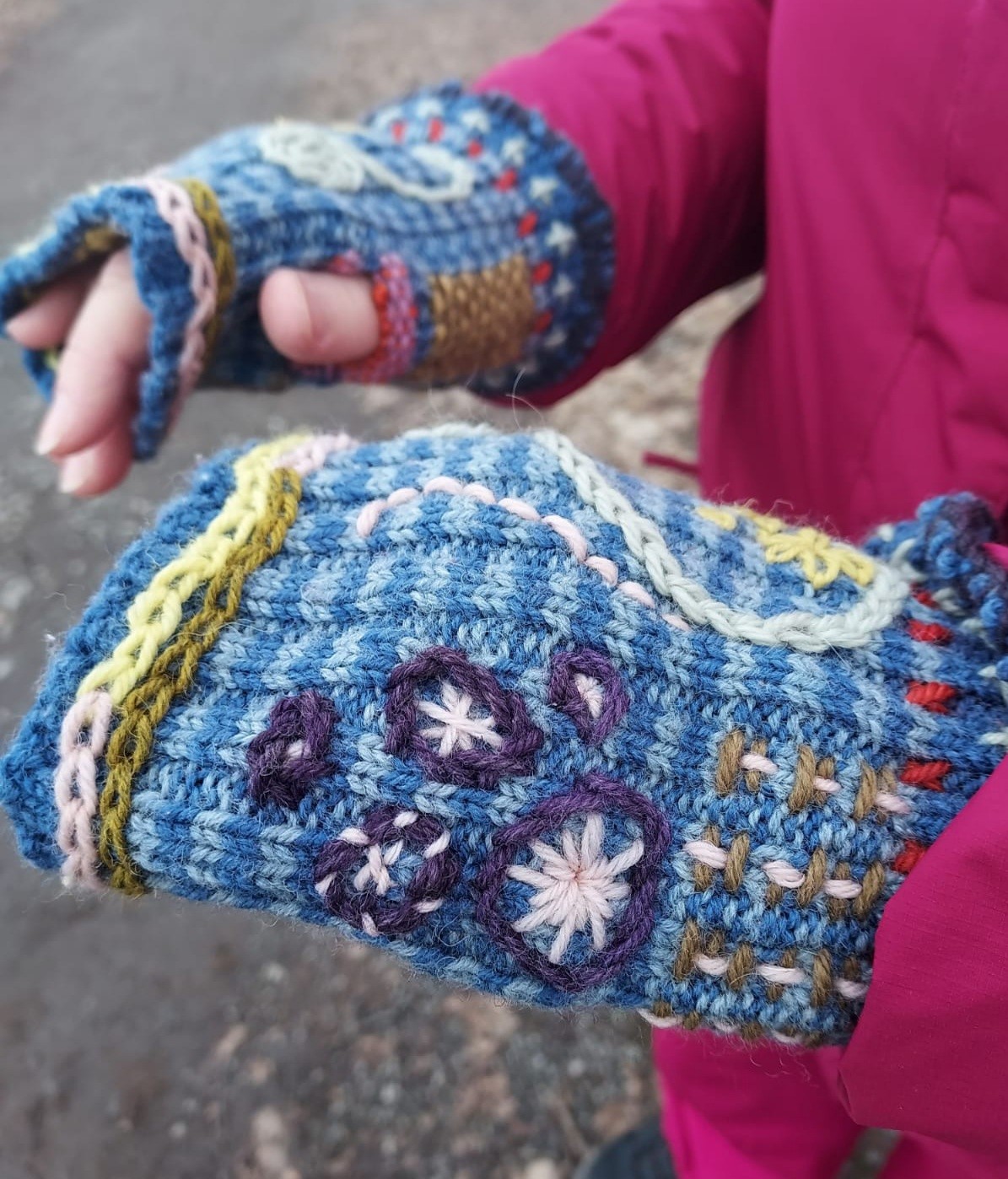 Edesmenneen anoppini kutomien villasukkien varret saivat uuden elämän. Kirjoin ja parsin niiden pinnan kasvivärjäämilläni langoilla. Sukanvarsista syntyi kämmekkäät lasten satupolulle.