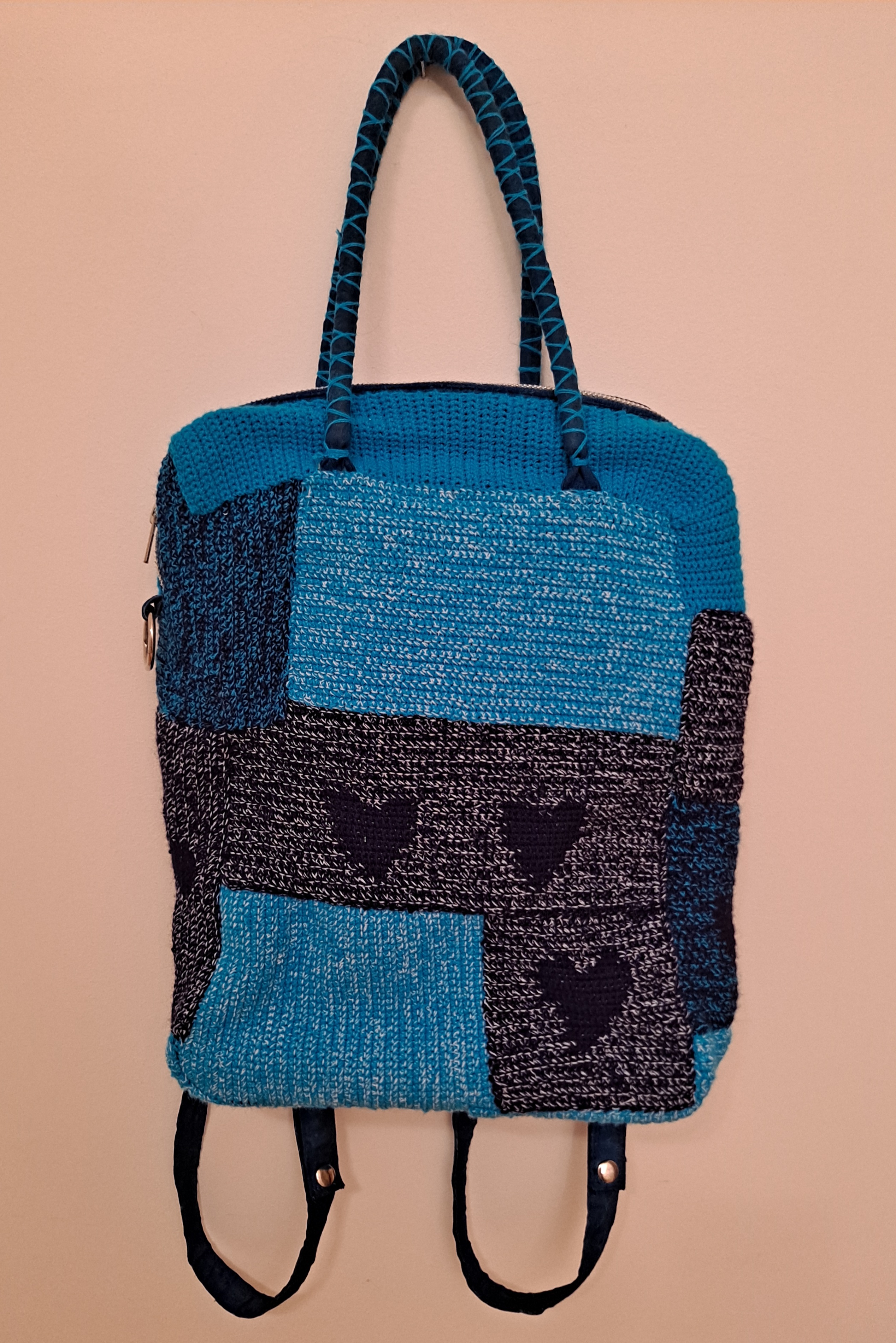 Vanha, kulunut reppuni sai uuden elämän jo aikaisemmin virkatuilla paloilla. Lempivärit tietenkin.