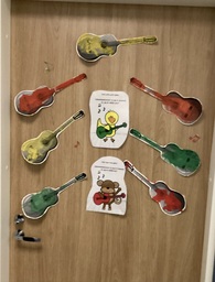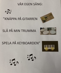 Vi började året med sagan: "Lilla-svampen-saga". I stora skogen hittar vi svampar med dörrar av olika färger. Bakom varje dörr finns ett djur som spelar ett instrument. Förutom att vi sjungit och låtasspelat på instrument har barnen lekt och pysslat instrument. Barnen fick limma med limpensel, göra handtryck på keayboard och måla, färglägga sin gitarr med vattenfärg. Vi har också skrivit och tonsatt en egen låt.