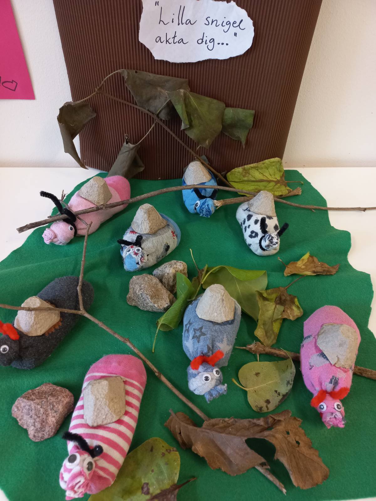Under förra veckan flyttade nästa djur in i vår skog, nämligen snigeln! Barnen var så förtjusta i att få laga en egen snigel av strumpa och ris. Barnen fick öva finmotoriken genom att sätta en sked ris i taget in i strumpan. Både Lilla snigel och ramsan om snigelns hus har också varit en stor succé i samlingen ☺️🐌