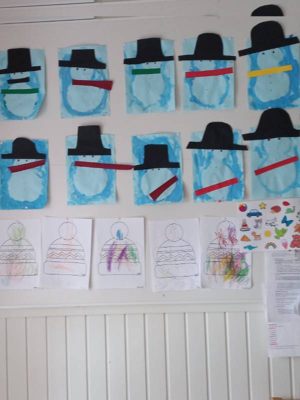De senaste veckorna har vi haft vinter som tema. Vi har gjort snögubbar och färglagt mössor.Samtidigt tränar vi på att använda lim, kritor och pennor.