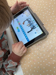 Förskolebarnen har fÄtt nya hörlurar och fÄr göra uppgifter pÄ pekplattan.