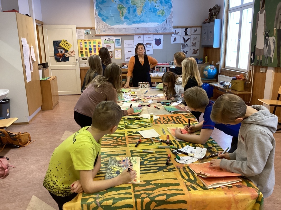 Höytiän neloset Hannele Torniaisen ohjauksessa kuvataidepajassa.