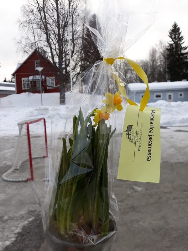 Yksinäinen narssissi oli tupsahtanut Höytiän koulun portaille. Kiitos sen tuojalle!