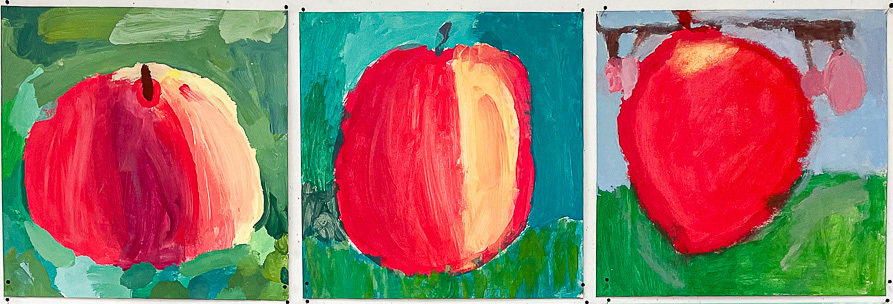 "Omppu pompuloita" Havainnoitiin omenoiden muotoa ja värivivahteita, sekoiteltiin vihreän ja punaisen sävyjä ja tutkittiin väriympyrää.