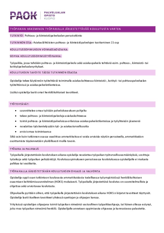 Asiakaslähtöisten puhtaus- ja kiinteistöpalvelujen tuottaminen 15 osp.pdf Jaa Sulje Tekijä: Hanni-Mari Larronmaa Tämän tiedoston tekstivastine: (tyhjä tekstivastine) Asiakaslähtöisten puhtaus- ja kiinteistöpalvelujen tuottaminen 15 osp.pdf 271.4 kt